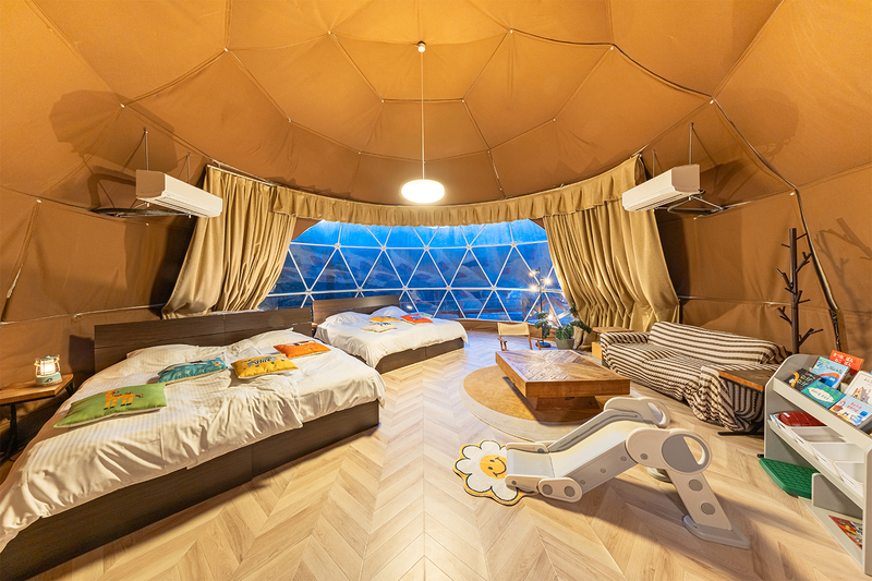 さらに、室内に滑り台、庭にストラックアウトを完備した新客室「ファミリードーム」もオープンし、雨の日でもお部屋がプレイルームに早変わりする、まさに子供たちの秘密基地のような空間で宿泊を楽しめます。