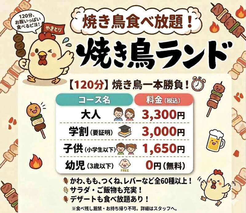 もも・とりかわ・つくね・砂ずりなどの定番串から揚げ物・釜めし・デザートまで、60種類以上が120分食べ放題で楽しめます。