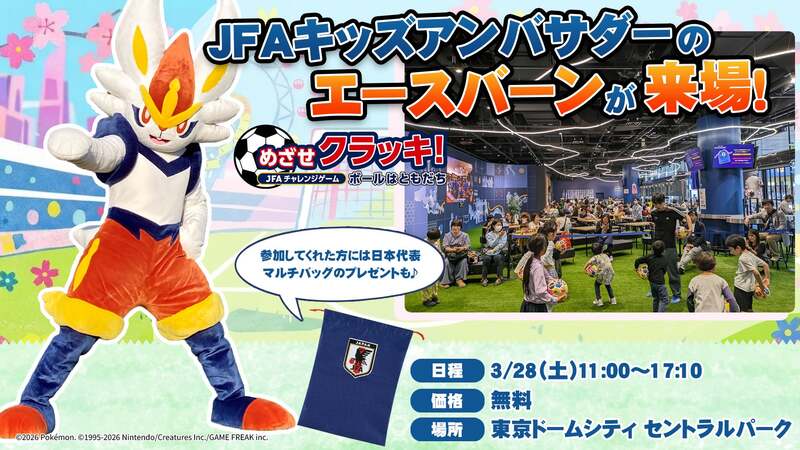 また、3月28日(土)には、4歳〜8歳の子供を対象にした無料のサッカー体験プログラム「JFAチャレンジゲーム めざせクラッキ!」も開催されます(事前申し込み制)。
