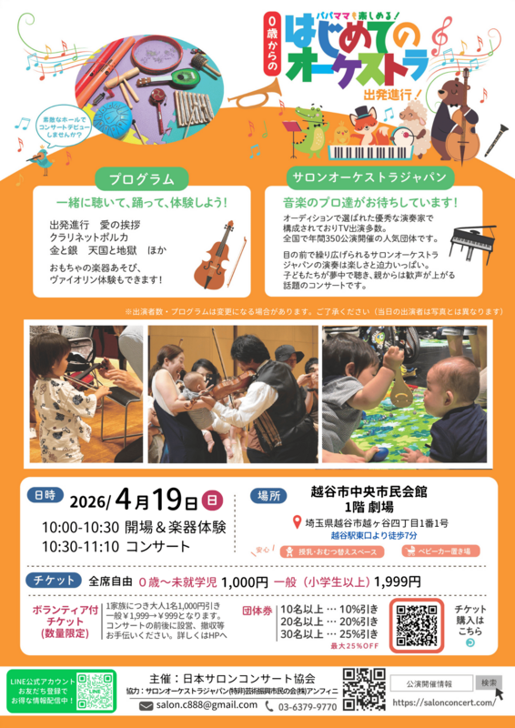 埼玉県越谷市の越谷市中央市民会館1階劇場にて、2026年4月19日(日)に「0歳からの・はじめてのオーケストラ」が開催されます。