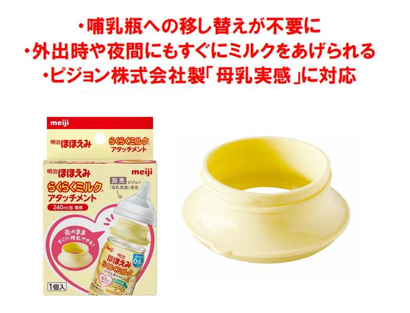 2026年1月にプルタブ缶へリニューアルした「明治ほほえみ らくらくミルク」の缶に装着するだけで、哺乳瓶への移し替えが不要になります。