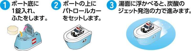 新発売の「おふろでトミカ バブボート パトロールカー」は、パトロールカーが乗ったボートに「バブ モンスターバブル かろやかDAYS」をセットすると、ジェット発泡の力でボートが湯面を進む仕掛けのおもちゃです。