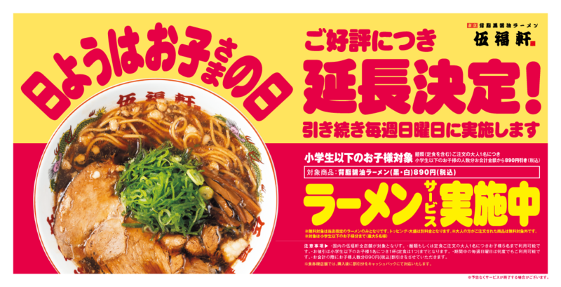 東京背脂黒醤油ラーメン「伍福軒」で、毎週日曜日限定のファミリー向けサービス「日ようはお子さまの日」が、好評につき延長されることが決定しました。