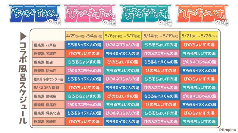 「ちろる&イヌくん」「ぴの&ネコちゃん」をイメージしたお風呂を含む全4種のコラボ風呂が、期間中4回に分けて登場します。