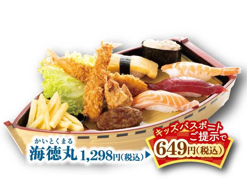 「海徳丸(かいとくまる)」は、大海原に出航する船の形をした器を使用し、子供に人気の寿司ネタと鶏の唐揚げ、エビフライ、ポテトフライなどを盛り合わせた豪華なメニューです。通常1,298円のところ、キッズパスポート提示で649円になります。