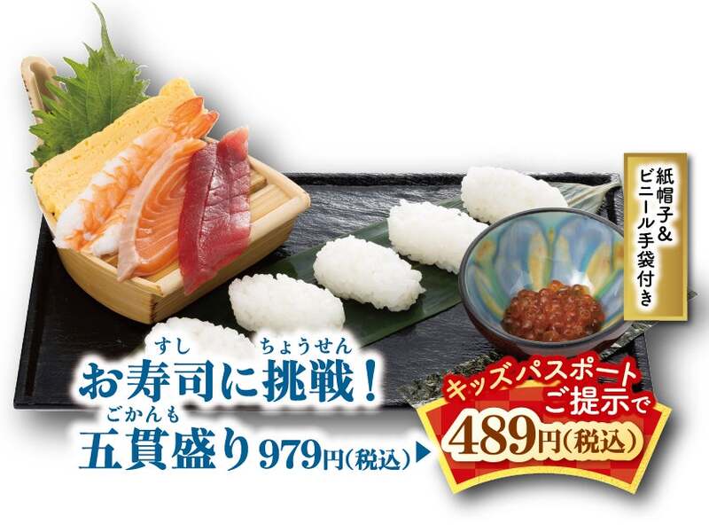 「お寿司に挑戦!五貫盛り」は、子供が自分でにぎりと軍艦のお寿司づくりを体験できる体験型メニューです。付属の紙帽子をかぶれば本物の寿司職人になった気分で楽しめ、食育にもつながります。通常979円のところ、キッズパスポート提示で489円になります。