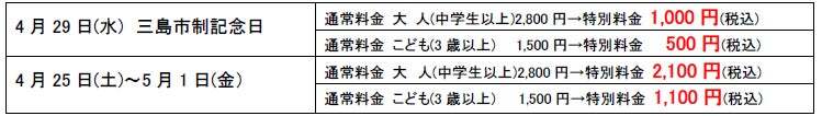 さらに4月29日(水)の三島市制記念日当日は、大人1,000円、子供500円というよりお得な特別料金が適用されます!